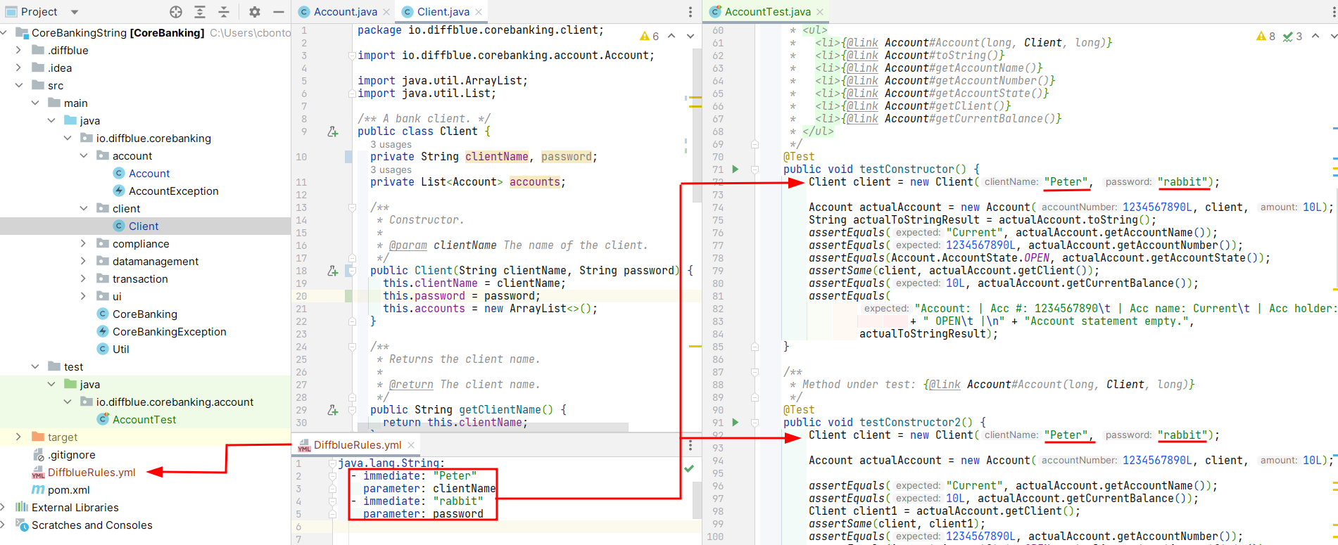 When writing unit tests, by default Diffblue uses predefined / context-based values for String objects. However, the user can come up with a specific String such as a name or a password. For example if the user needs to use “Peter” wherever in the codebase an argument called clientName appears and “rabbit” for an argument called password, the syntax will be:
