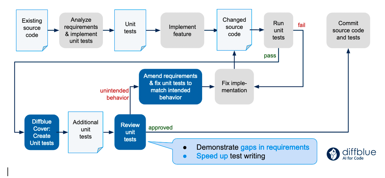 In this use case, we started the TDD process as usual by analyzing the requirements and implementing the unit tests. Then we implemented the feature to make the unit tests pass. At this point we would usually stop and commit the code. The value add that Diffblue Cover Plugin for IntelliJ provides for us is that it gives us additional tests that might include cases that we haven’t considered in our initial requirements analysis. That means that Diffblue Cover helps us identify gaps in the requirements. We did that by reviewing the tests Diffblue Cover created for us, amending the requirements with the missing cases and adapting the unit tests to match these unforeseen requirements. We then completed the implementation to make the unit tests pass.