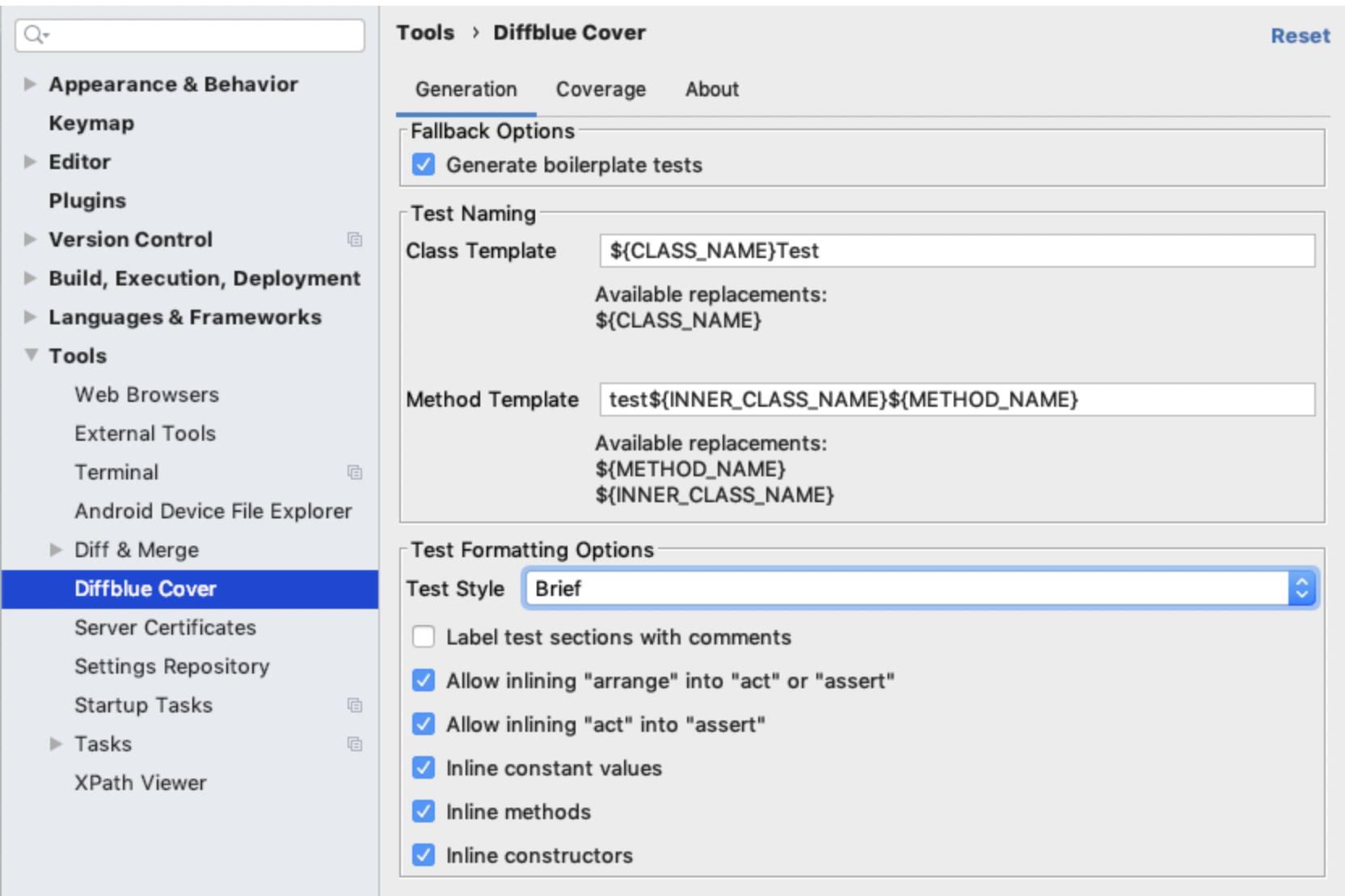 It is possible to configure a number of settings, under Test formatting options, which control the inlining behavior of Diffblue Cover: