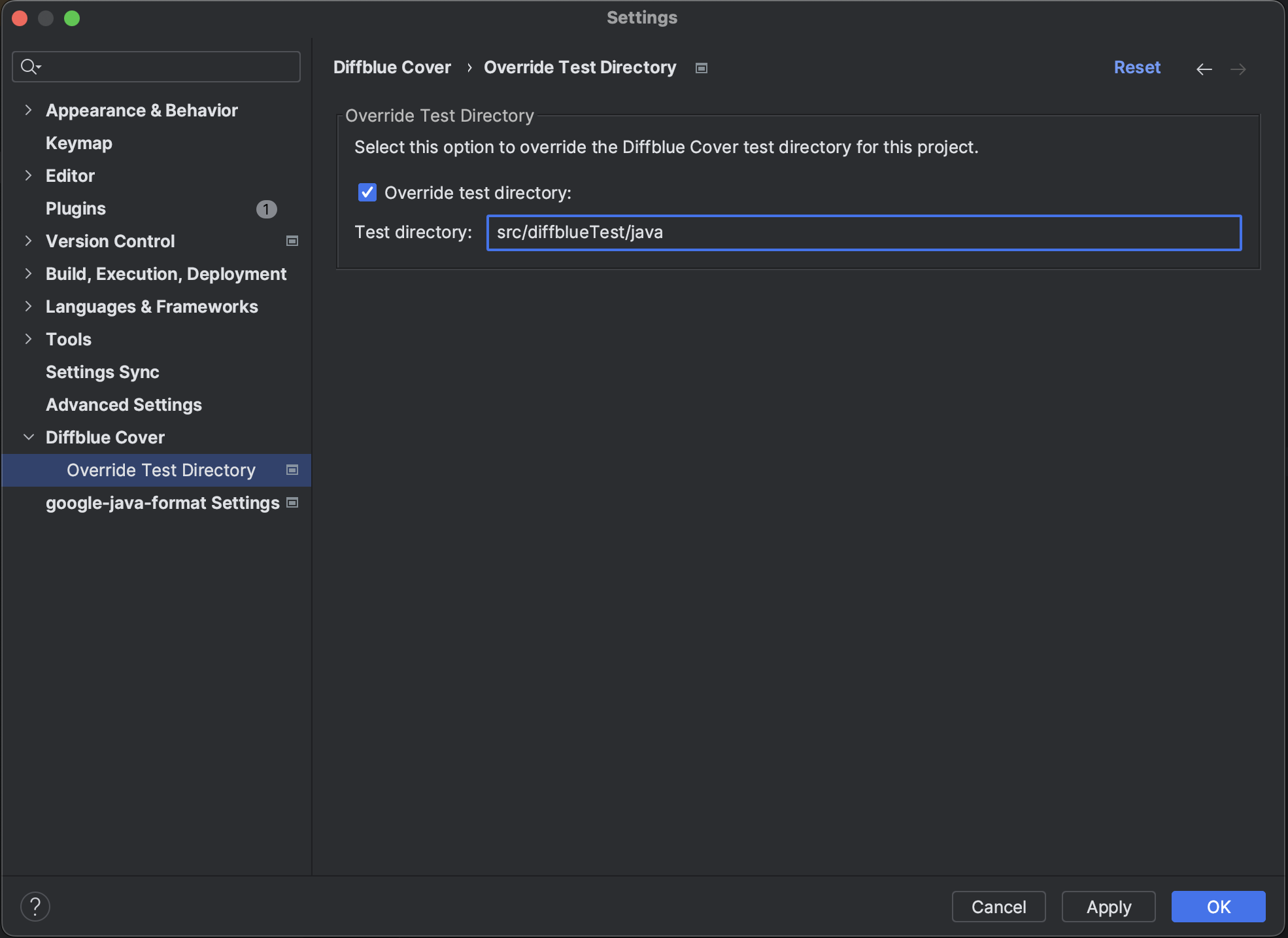 If you have multiple test source directories set up for a module, you can use the Override Test Directory setting (Diffblue > Change Settings) to ensure that Cover Plugin creates tests in your preferred directory.