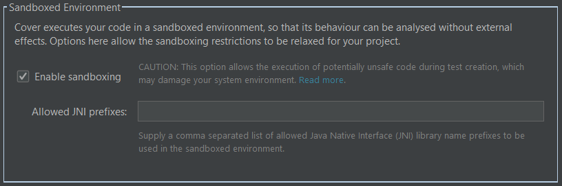 * Note that if the Diffblue sandbox policy is blocking access to a JNI library that you believe to be safe to use, then you can add it to the JNI allow list (a comma separated list of JNI library name prefixes can be used):