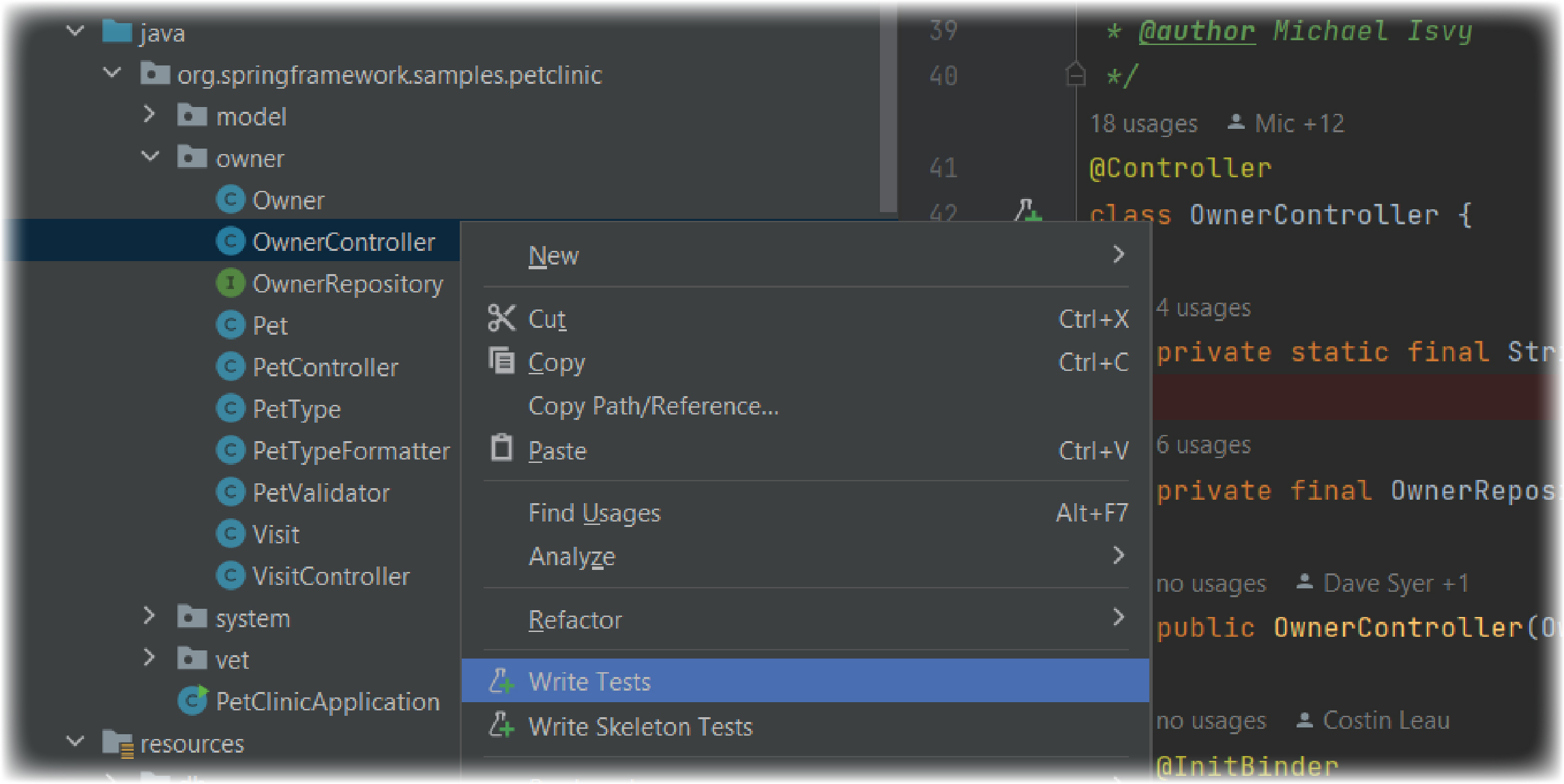 Write Testsgutter icon next to the lineclass OwnerController. - 3.Click the links in the Diffblue Cover panel to see the tests produced - example below.