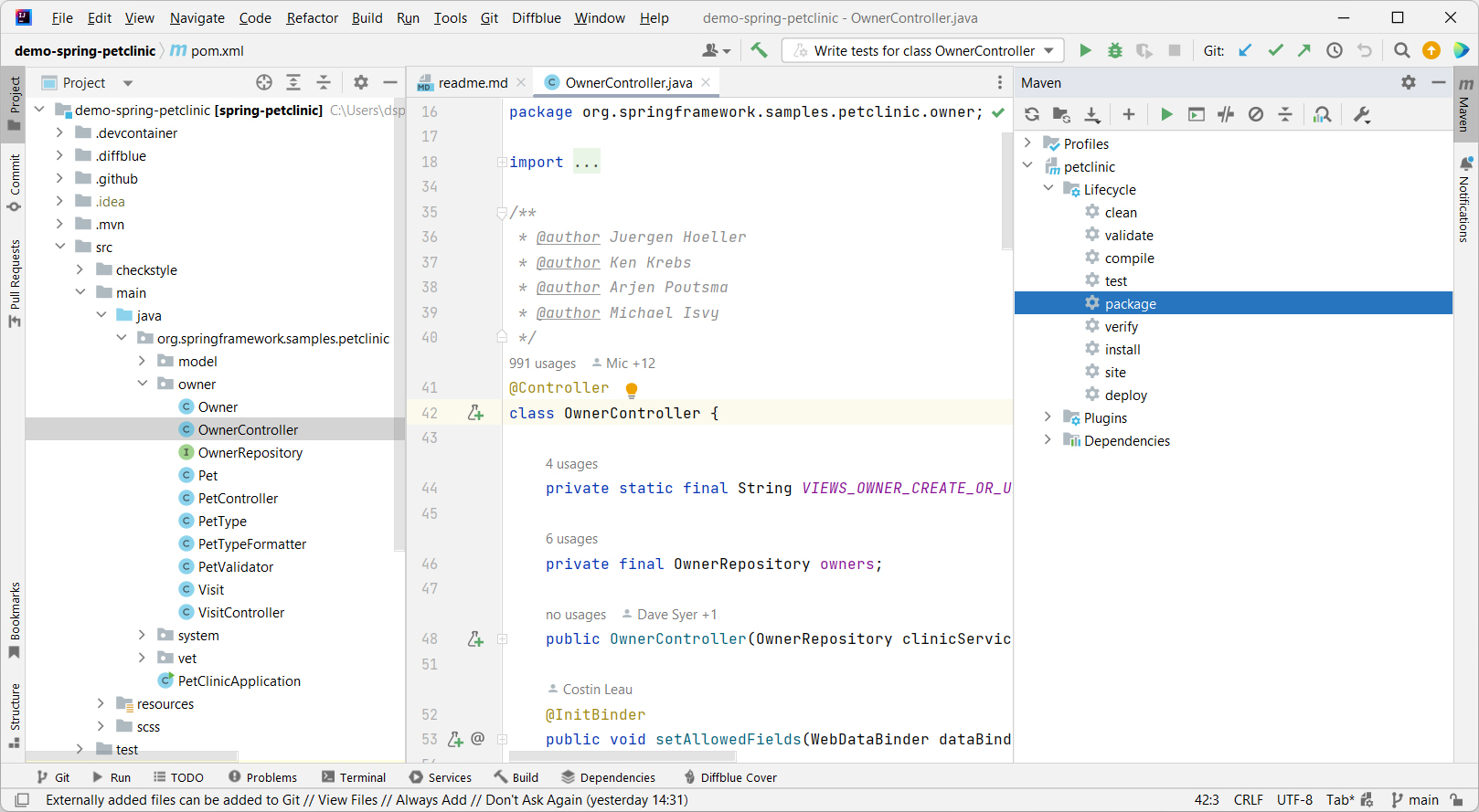 Maven tab, open petclinic > Lifecycle, and double-click package.