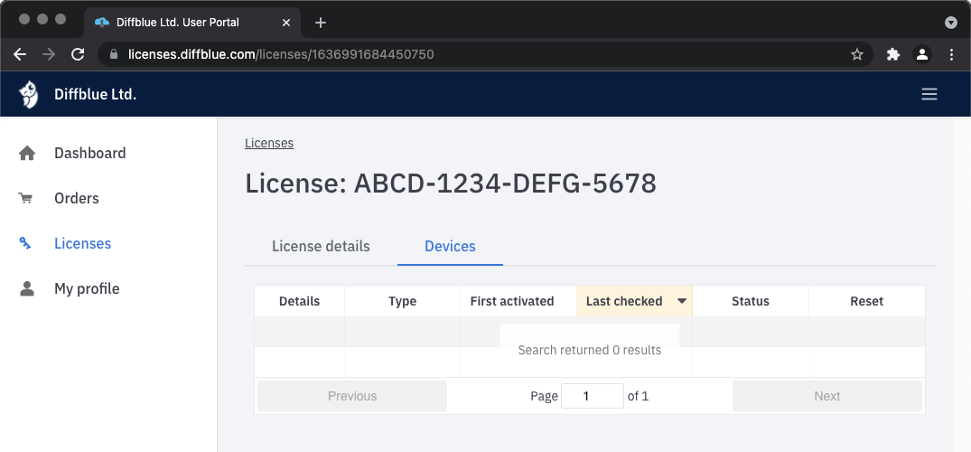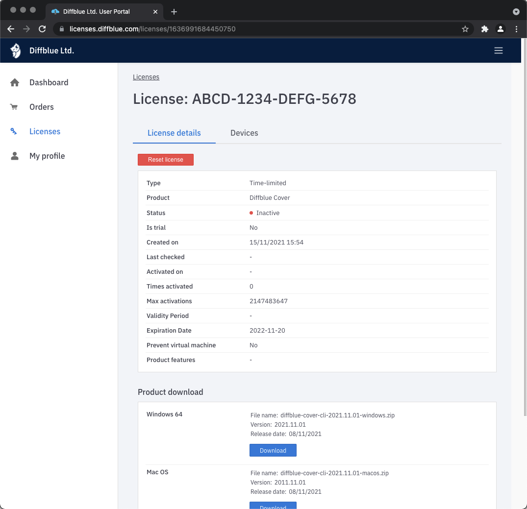 If you click on one of the licenses in the license list you will be taken to a page with more information about that license. This page also has a button where you can reset the activations for that license.