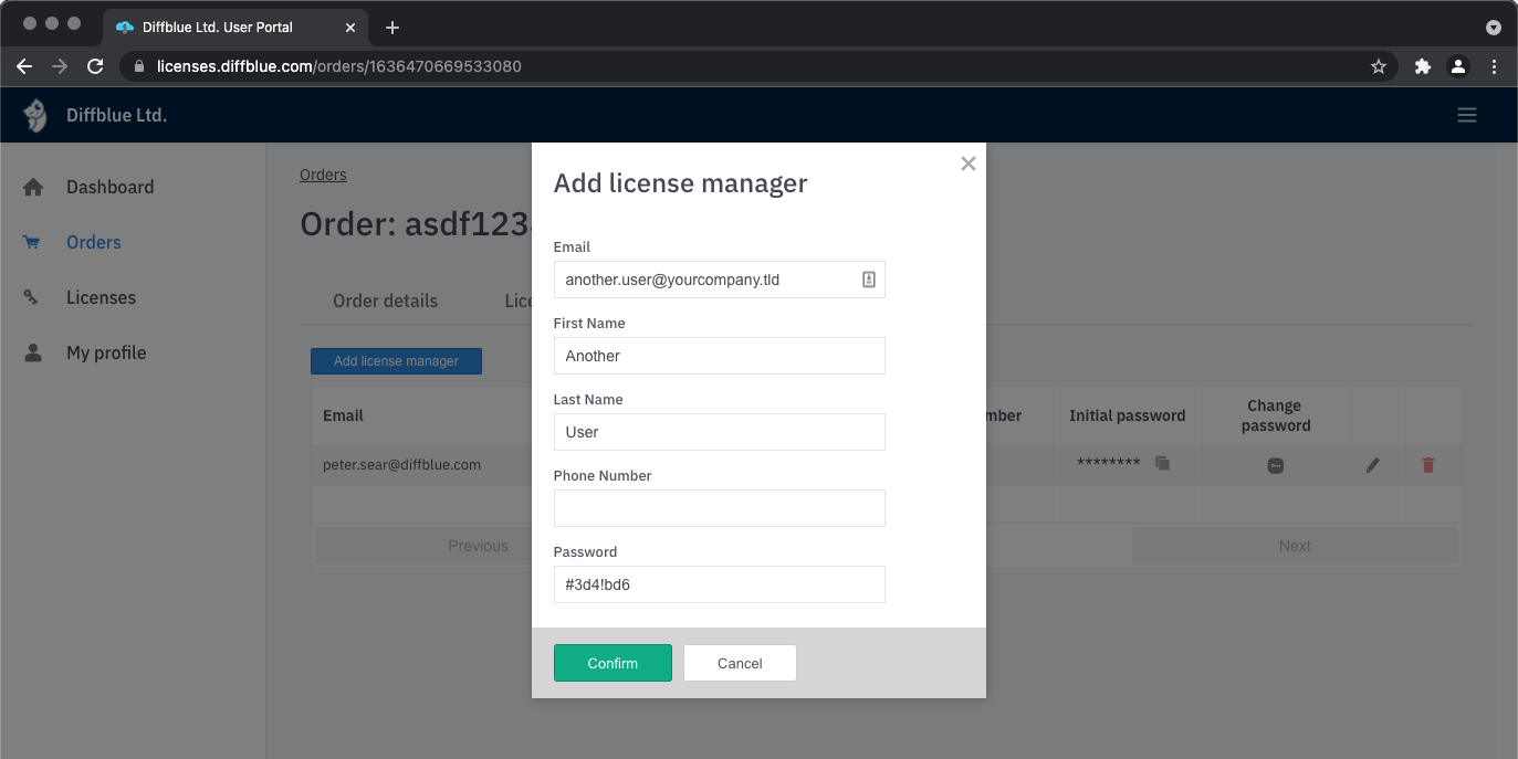 After clicking on the Add license manager button you will be given a short form to fill out. Input the email address, first name and last name. Take note of the automatically generated password or supply your own. These details are not automatically sent to the new license manager so you will have to email them yourself or provide them via some other channel.