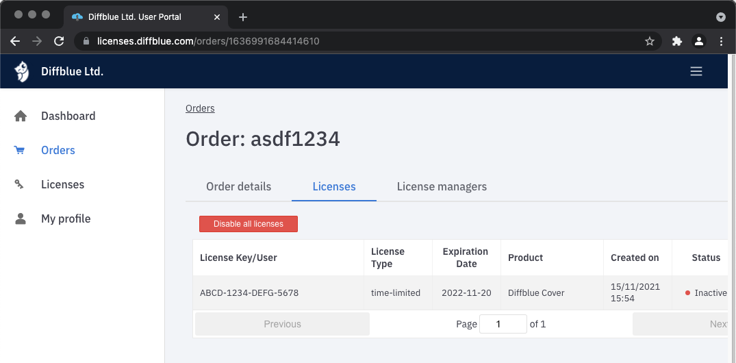 If you click on Licenses you will get a list of the license keys associated with the order. If there are many keys you will have multiple pages of licenses. The list includes the expiration date of the licenses and 'Status' indicates whether or not they have been activated.