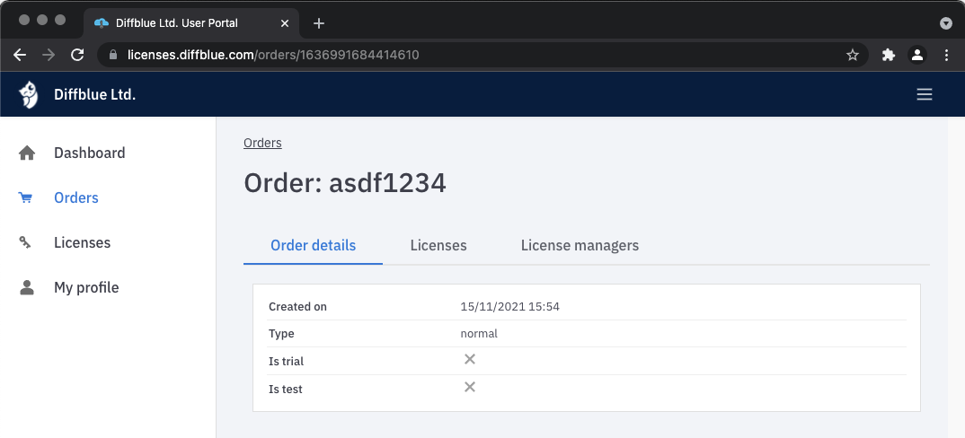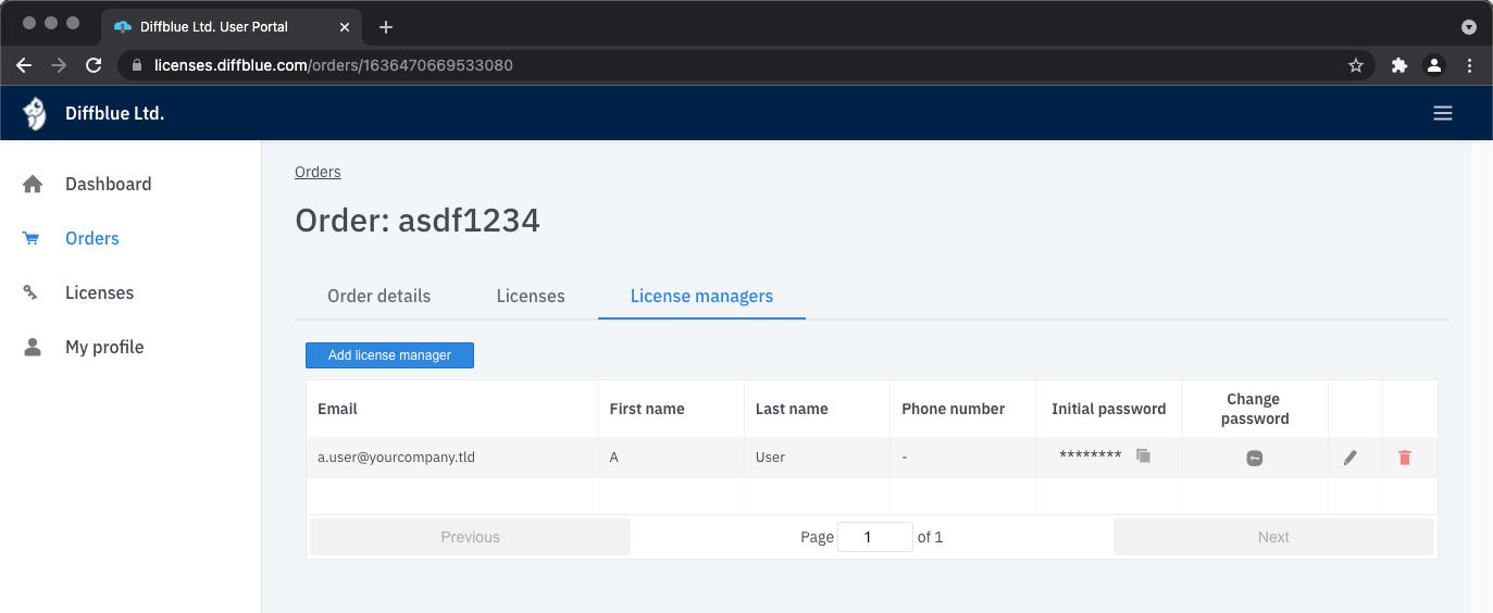 If you click on License managers you can see a list of the license managers assigned to this order. You can also use the Add license manager button to add a new license manager.