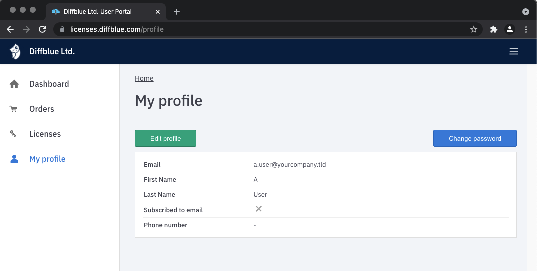 You can edit your license manager profile by clicking on the My profile button in the left hand menu. From here you can change your first name, last name and also change your password.