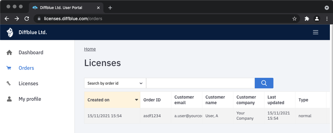 Click on the Order button on the left hand menu bar to get a list of the orders you are managing. Each order can have 1 or more licenses associated with it. Click on an order to see the licenses it contains.