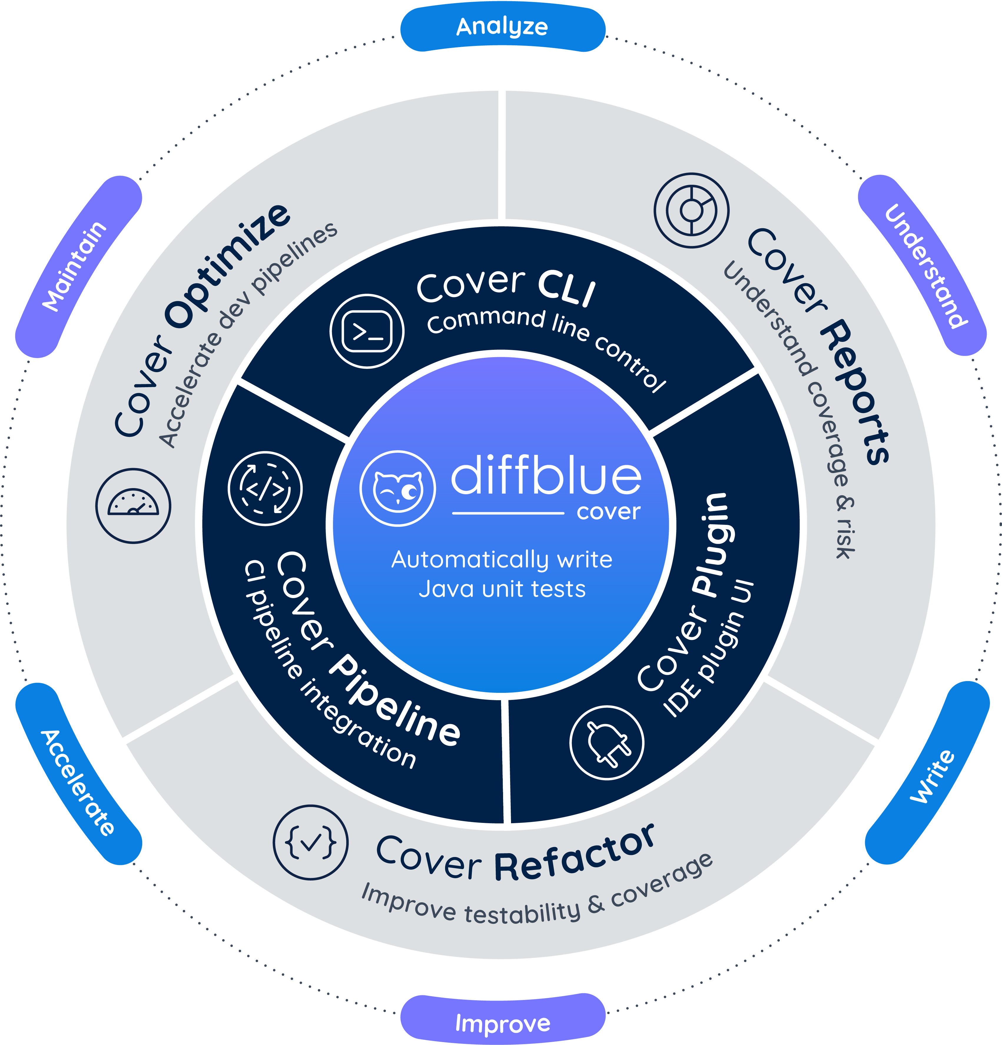 Diffblue Cover is a generative AI platform that automatically writes comprehensive, human-like Java unit tests - saving developer time, increasing test coverage, and reducing regression risks. Cover is provided as an IntelliJ IDE plugin (Cover Plugin), a CLI application (Cover CLI), and a CI integration to provide fully autonomous operation (Cover Pipeline). Three additional components (Cover Reports, Cover Optimize, and Cover Refactor), for test management and analytics, complete the Diffblue Cover platform.
